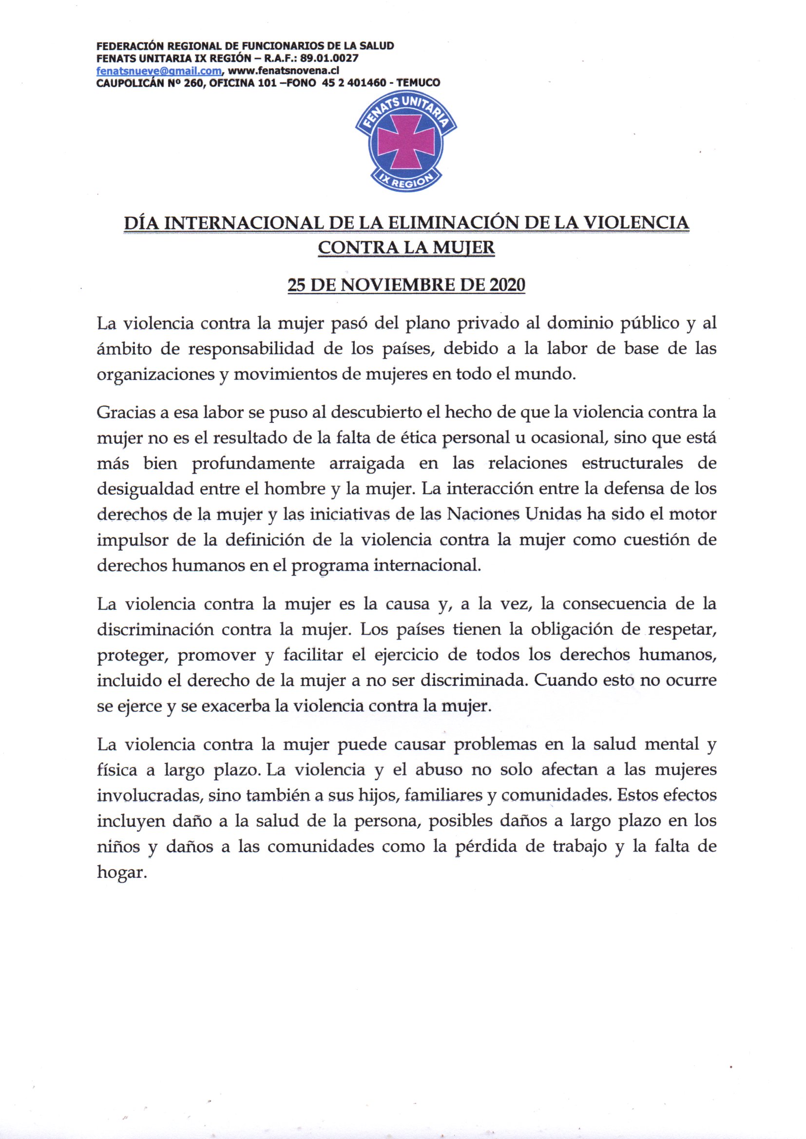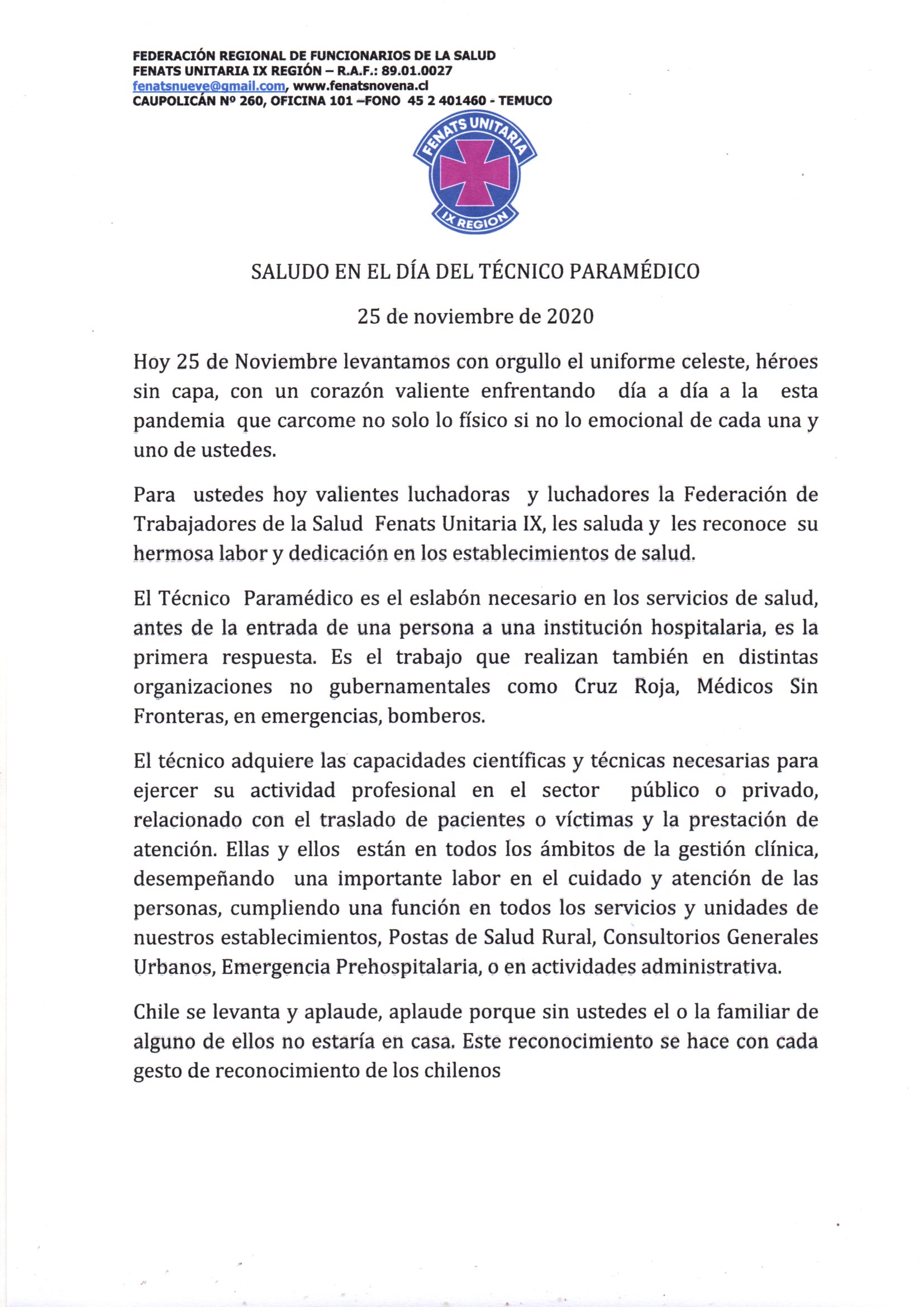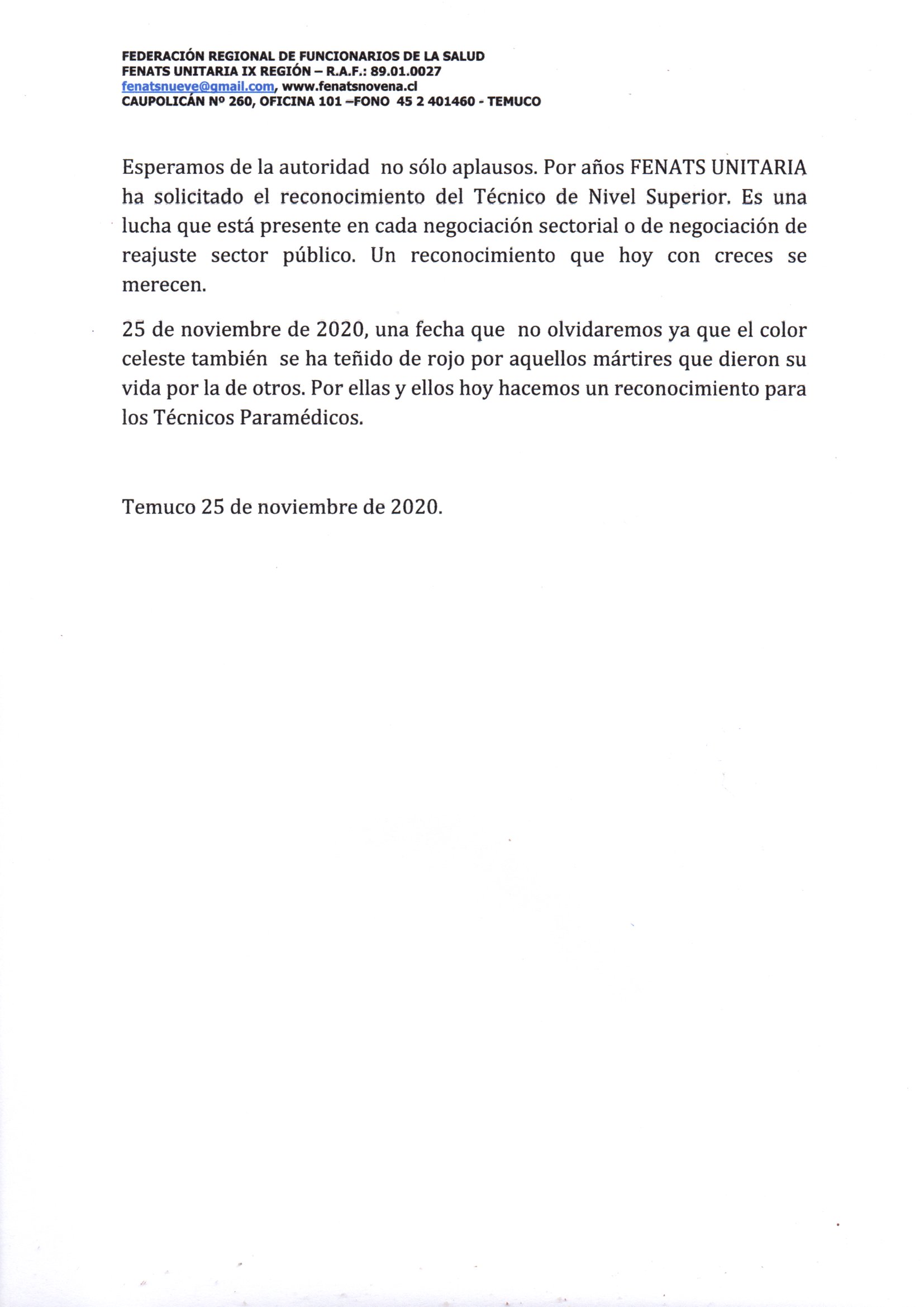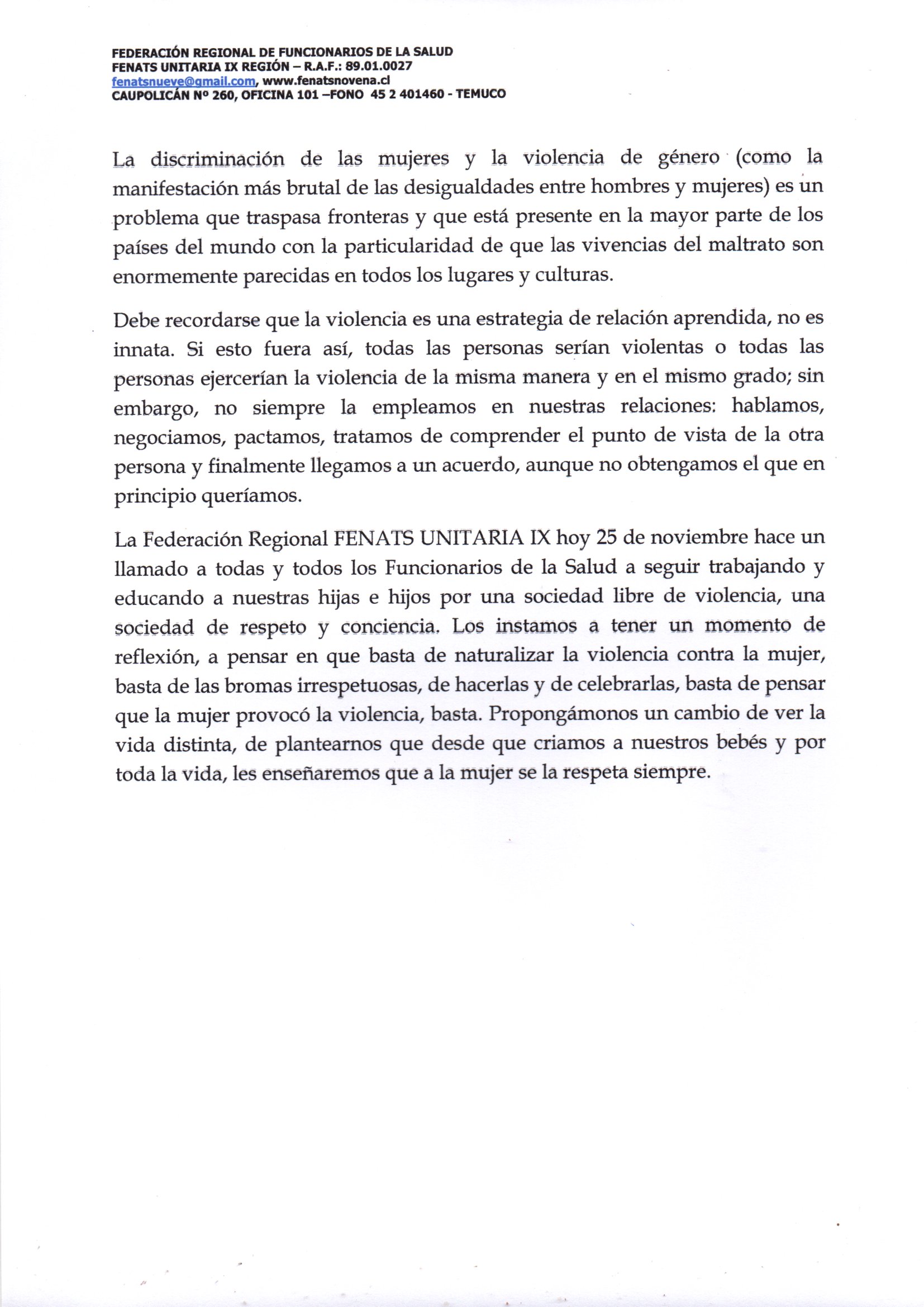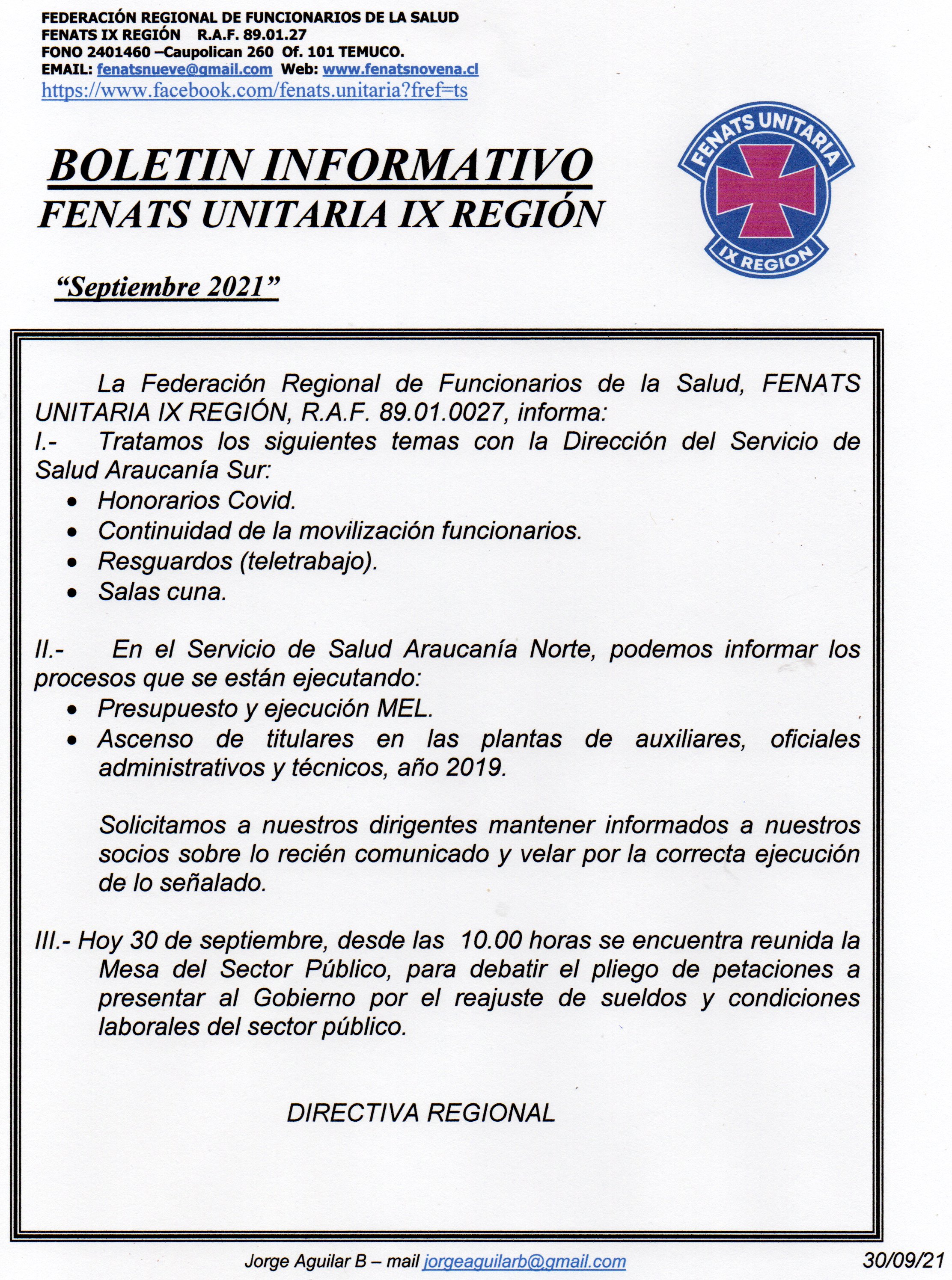 La Federación Regional de Funcionarios de la Salud, FENATS IX REIÓN, R.A.F. 89.01.0027, informa: