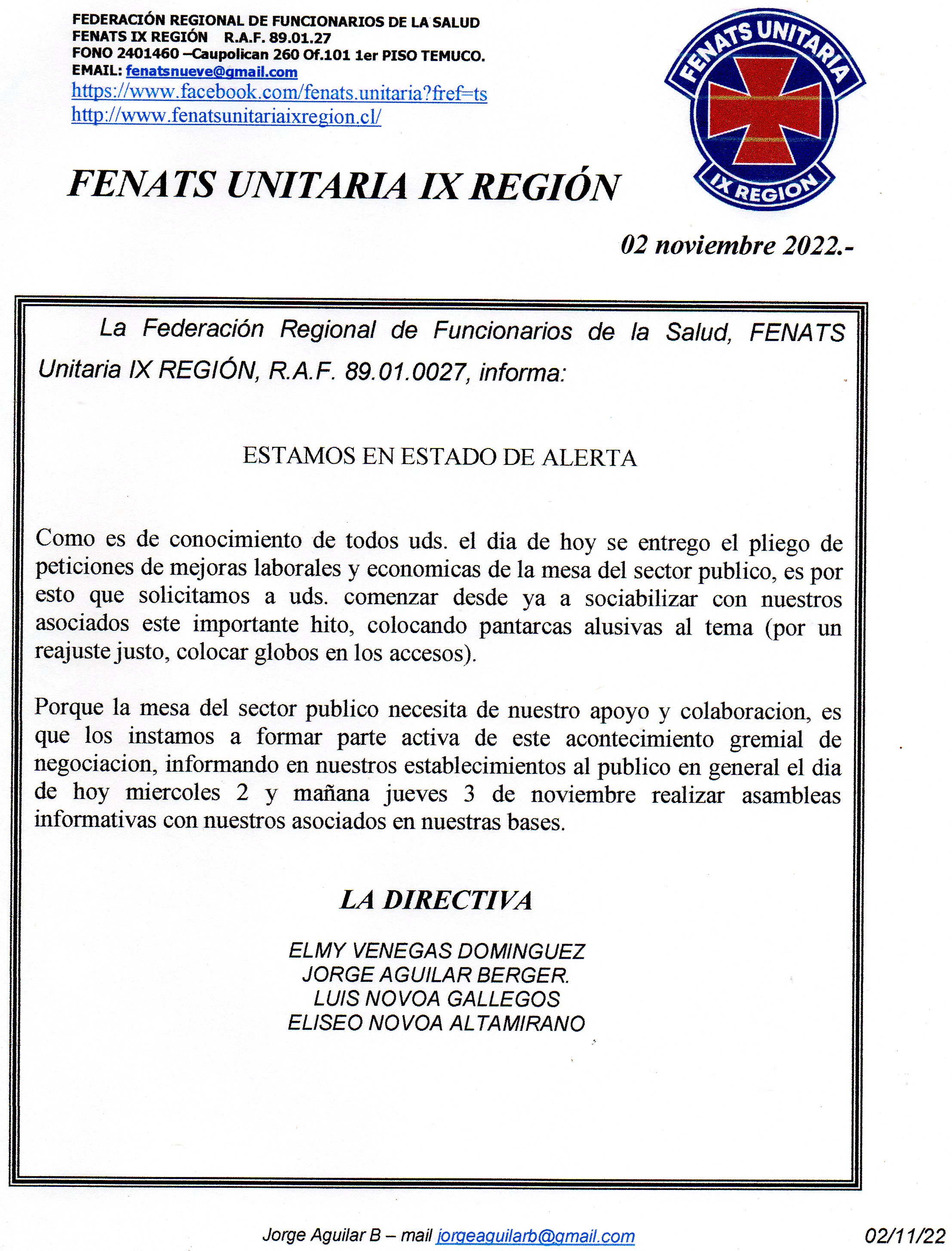 La Federación Regional de Funcionarios de la Salud, FENATS IX REGIÓN, R.A.F. 89.01.0027, informa: