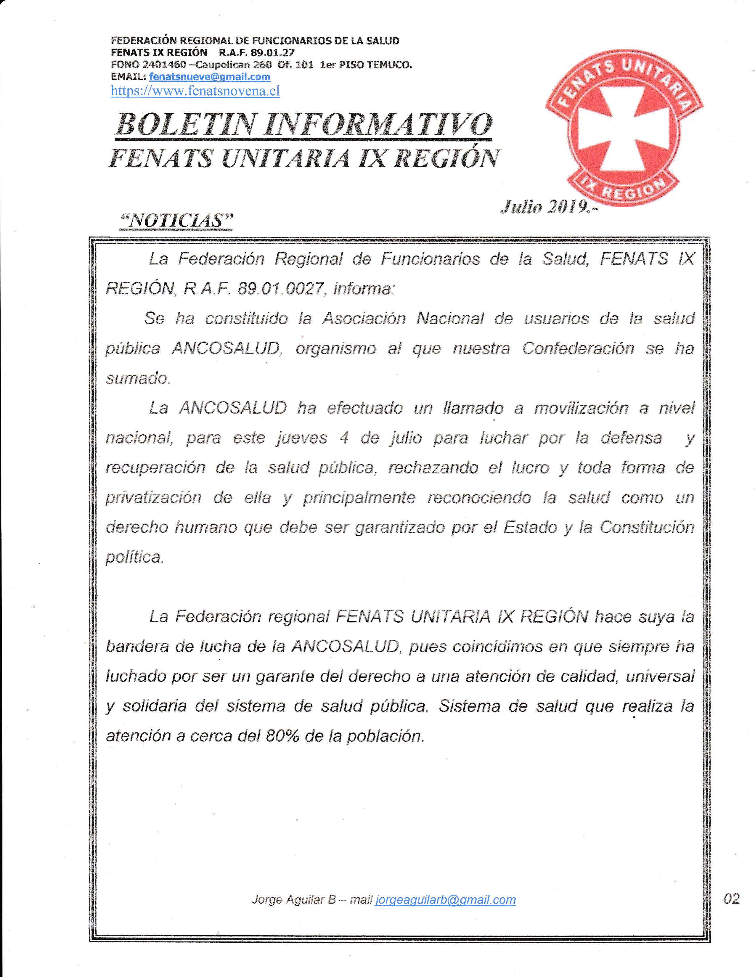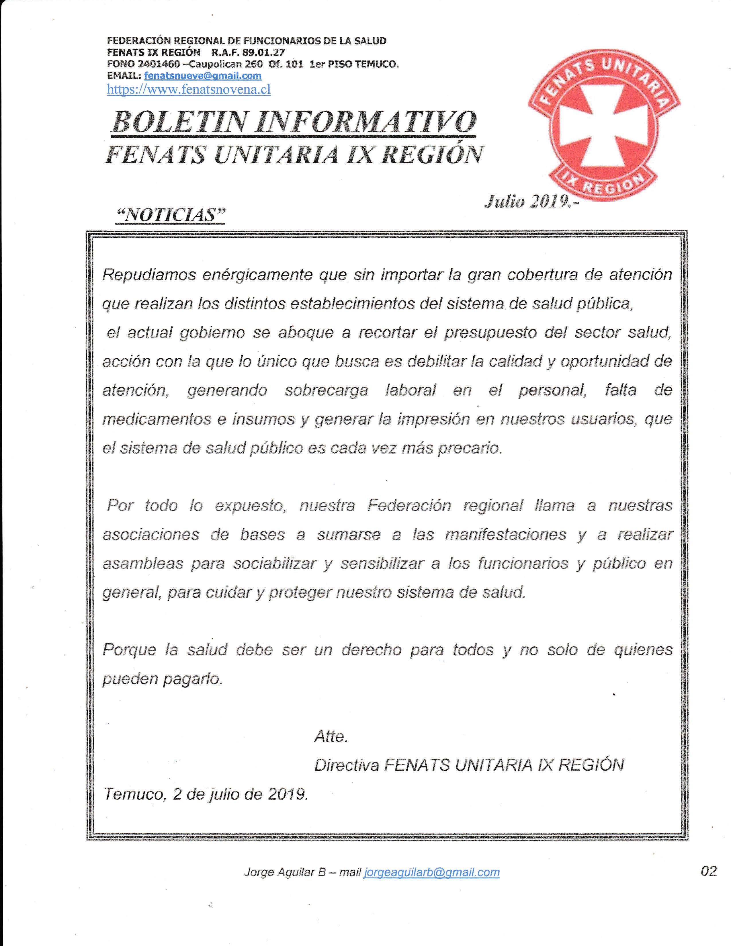 Comunicado 2 de Julio 2019 La Federación Regional de Funcionarios de la Salud, FENATS IX REGIÓN, R.A.F. 89.01.0027, informa: