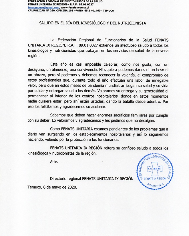 Saludo día nutricionista y kinesiologo La Federación Regional de Funcionarios de la Salud, FENATS IX REIÓN, R.A.F. 89.01.0027, informa: