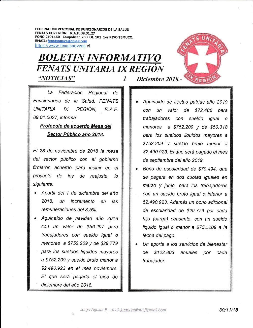 Reajuste Sector Publico Año 2018 La Federacion Regional de Funcionarios de la Salud, FENATS IX REIÓN, R.A.F. 89.01.0027, informa: