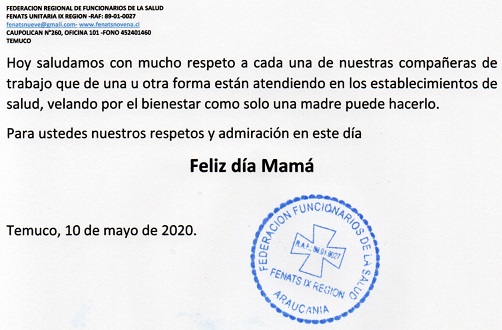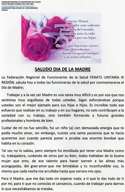 La Federación Regional de Funcionarios de la Salud, FENATS IX REIÓN, R.A.F. 89.01.0027, informa: