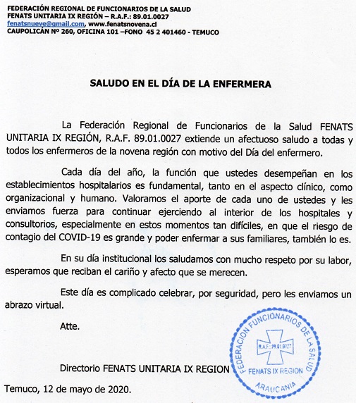 La Federación Regional de Funcionarios de la Salud, FENATS IX REIÓN, R.A.F. 89.01.0027, informa: