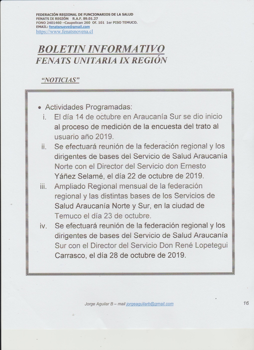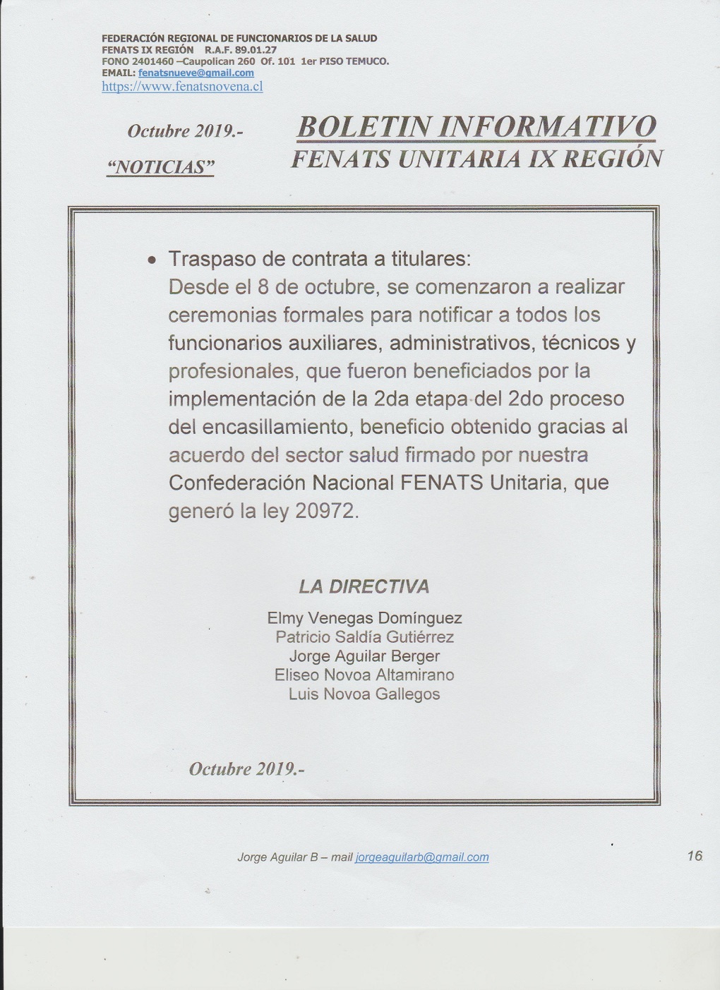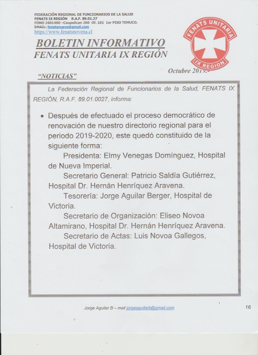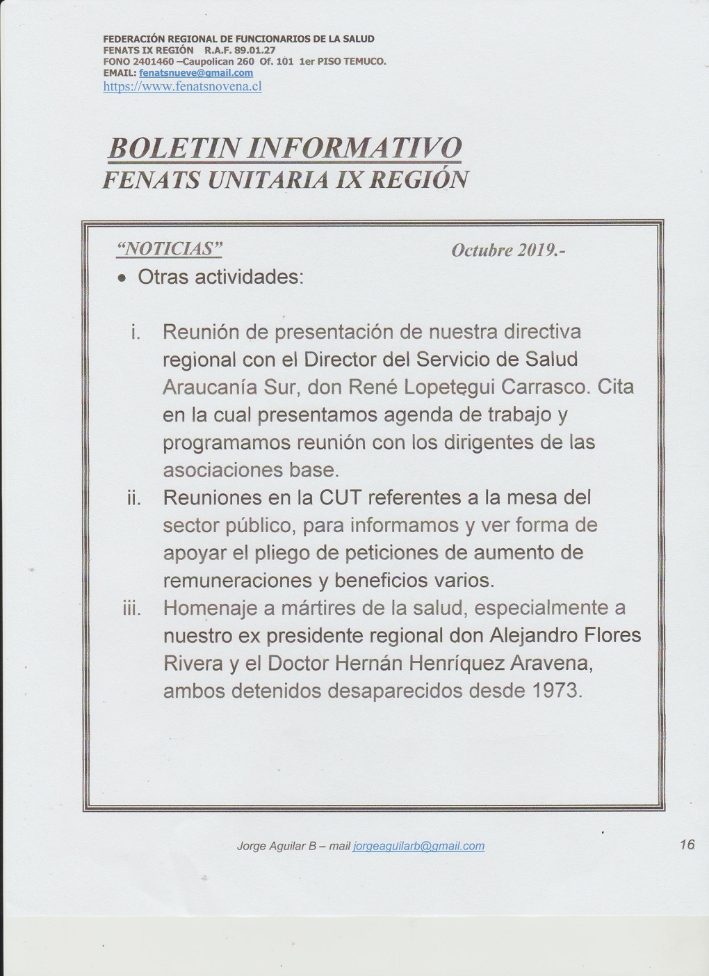 Boletín Informativo Octubre 2019 La Federación Regional de Funcionarios de la Salud, FENATS IX REGIÓN, R.A.F. 89.01.0027, informa: