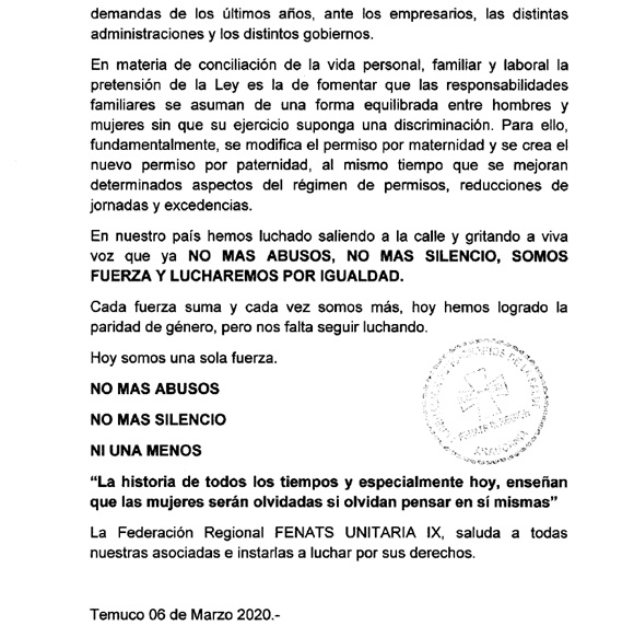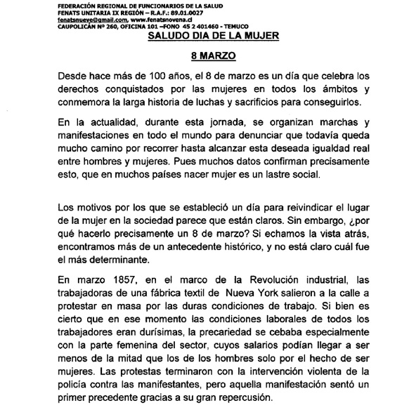 Saludo día de la Mujer, 8 de marzo 2020 La Federación Regional de Funcionarios de la Salud, FENATS IX REGIÓN, R.A.F. 89.01.0027, informa: