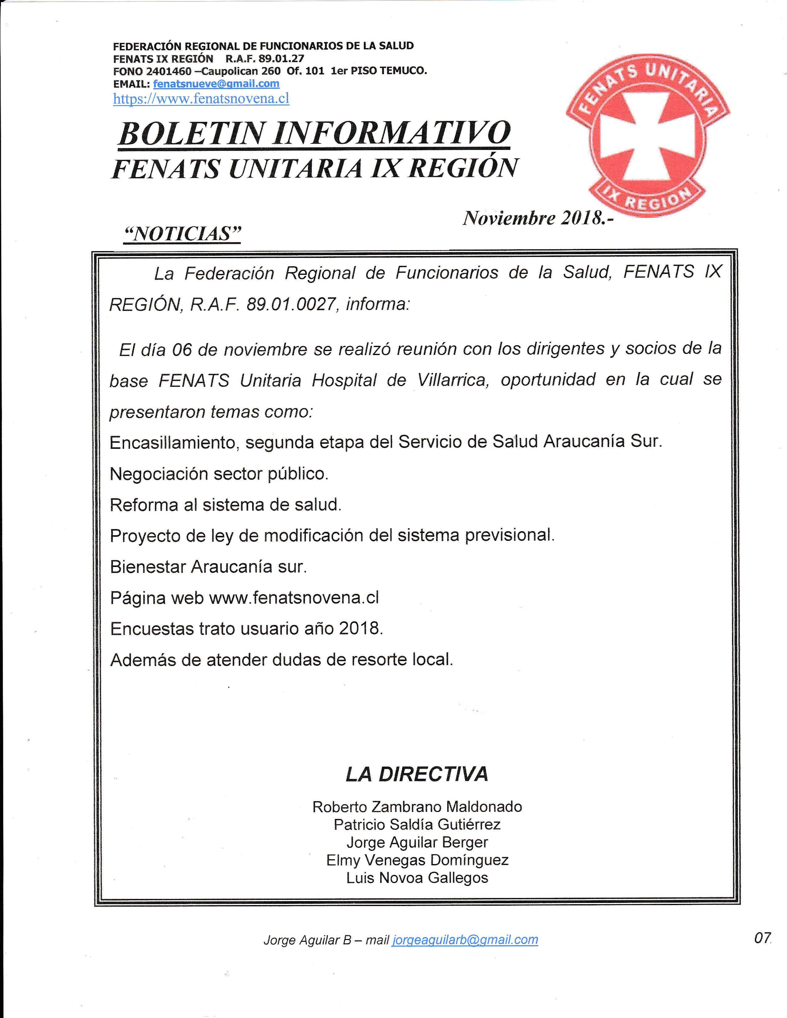 Boletin N°6 año 2018 La Federacion Regional de Funcionarios de la Salud, FENATS IX REIÓN, R.A.F. 89.01.0027, informa: